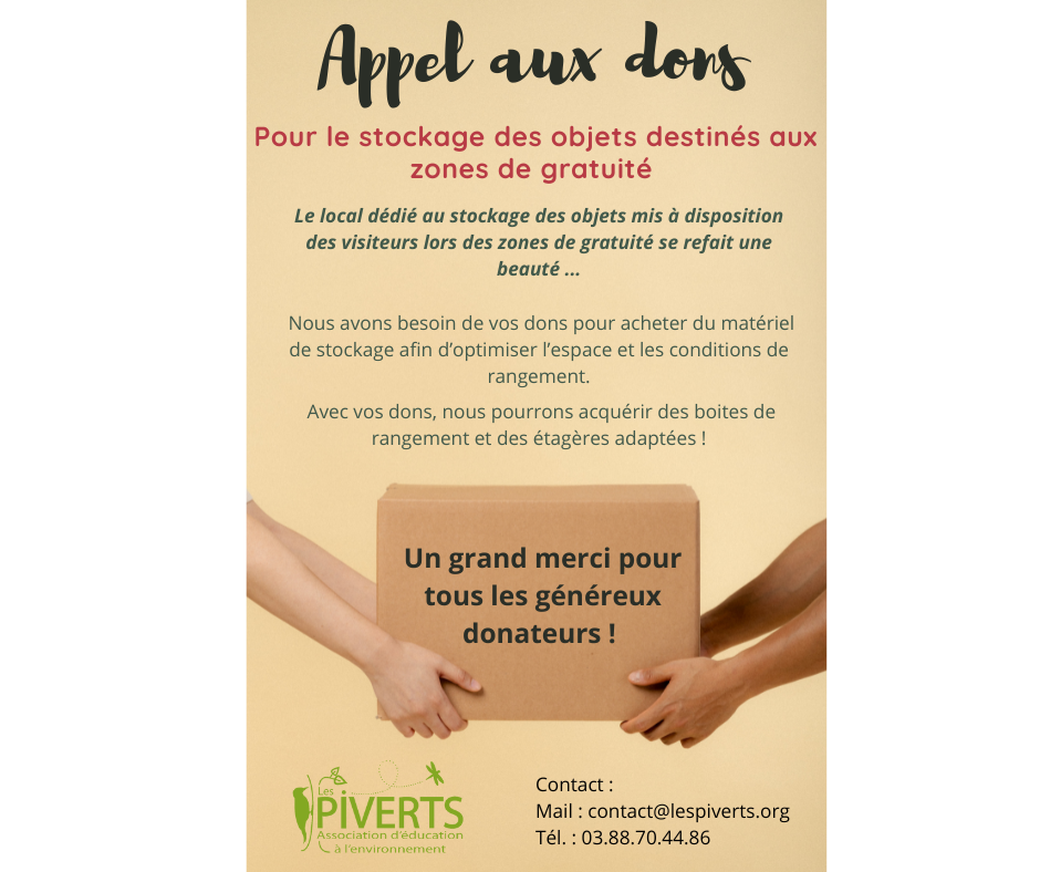 Pour améliorer le stockage des objets destinés aux zones de gratuité, nous lançons un appel aux dons pour acheter du matériel de rangement comme des boites et des étagères adaptés.